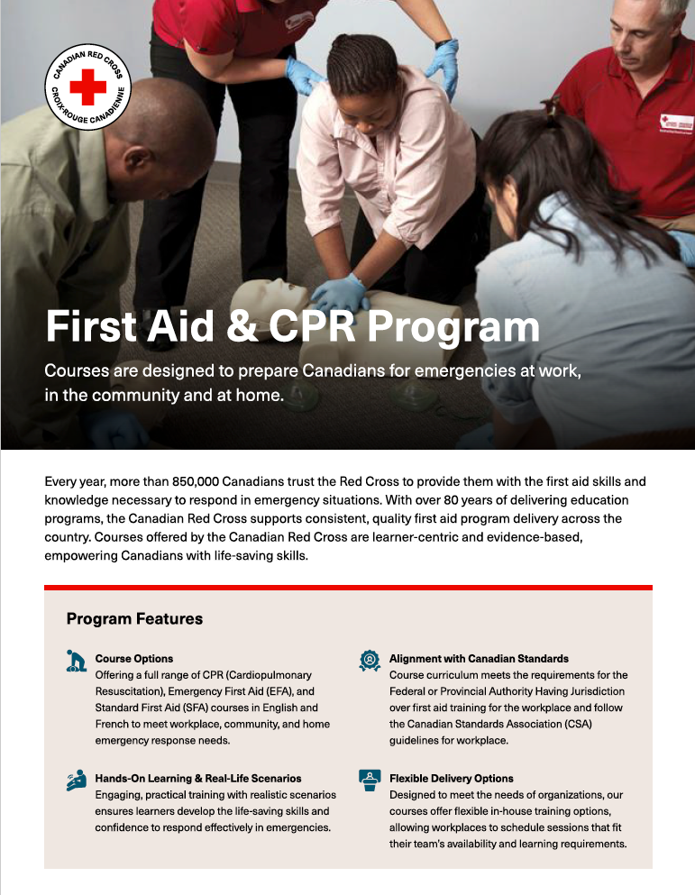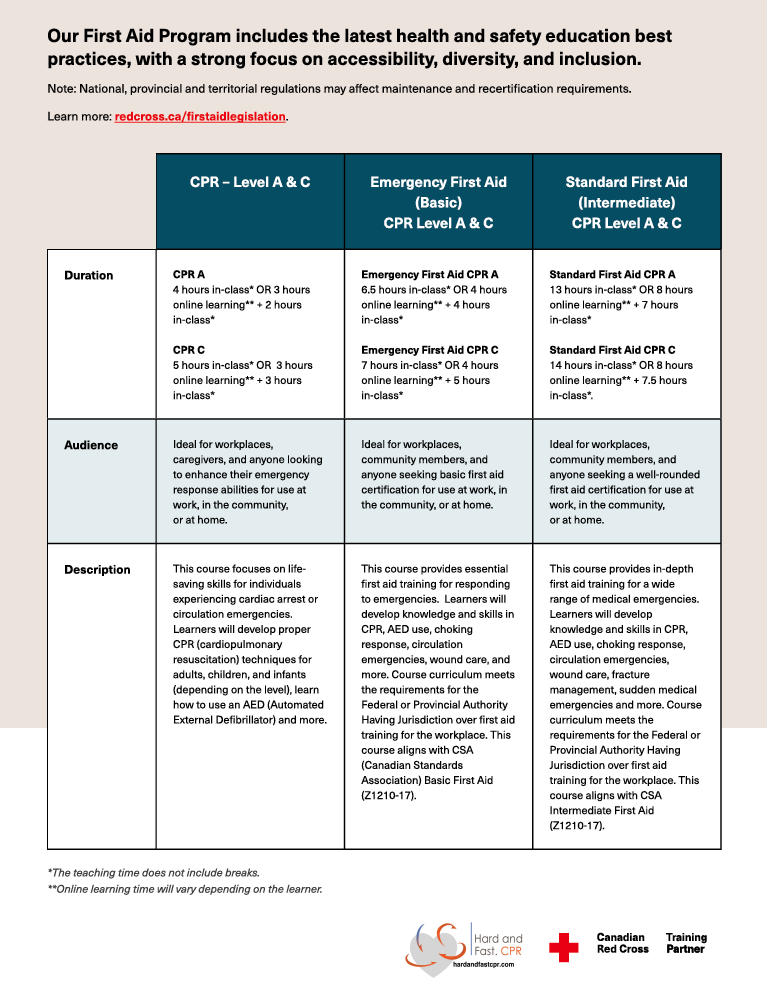 Course meets legislation requirements for provincial/territorial worker safety and insurance boards and includes the latest first aid and CPR guidelines.